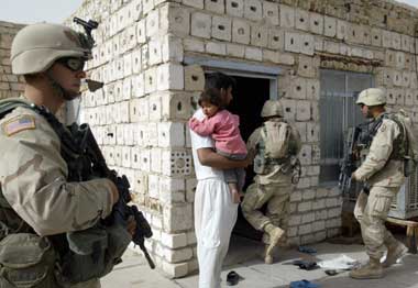 "But it is clear that Iraqi forces will not be able, on their own, to deal with these threats by June 30 when an Iraqi government assumes sovereignty." Five of the 10 latest U.S. combat deaths were Marines who were killed in bloody clashes against scores of heavily armed guerrillas near the Syrian border, the U.S. military said. Ninety-nine U.S. soldiers have been killed in action this month -- more than the number of U.S. combat deaths in the three-week war that toppled Saddam. The heaviest fighting at the weekend was in Qusayba on the Syrian border where the U.S. military said 25 to 30 guerrillas had also been killed. "Marines continued to bring coordinated fire against the enemy force of approximately 120 to 150 fighters throughout the day and into the night," the military said in a statement. HUMAN SHIELDS The Marines said women and children had surrounded guerrilla mortar positions, apparently as human shields. General Richard Myers, chairman of the U.S. Joint Chiefs of Staff, told CNN guerrillas in the Sunni bastion of Falluja, 50 km (32 miles) west of Baghdad, had also used human shields. U.S.-led forces, who have battled for months to end Sunni guerrilla attacks, have faced a new front this month because of a Shi'ite uprising led by rebel cleric Moqtada al-Sadr. The number of civilians killed this month -- reported by doctors to be in the hundreds -- has angered many Iraqis and triggered kidnappings of foreign civilians from more than a dozen countries. Talks are going on to bolster a shaky truce in Falluja and to prevent violence in Najaf, a holy city to Iraq's Shi'ite majority, where Sadr is holed up and protected by his militia. Sadr's spokesman Qays al-Khazali told a news conference the cleric's Mehdi Army militia would halt military operations in and around Najaf during commemorations Monday and Tuesday for the anniversary of the Prophet Mohammad's death. About 2,500 U.S. troops have been poised on the outskirts of Najaf for several days, with orders to kill or capture Sadr. U.S. officials demand that the cleric disarm his Mehdi Army and turn himself in to stand trial in an Iraqi court for the murder last year of a moderate Shi'ite cleric in Najaf. Falluja enjoyed a second day of calm. U.S. Marines launched a crackdown in