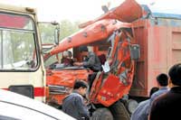 The truck collided with two mini-buses when it began driving against traffic at 9:28 a.m. today. Acting on reports, local police organized efforts to intercept the truck. However, Yang's truck broke through four police blockade lines. When it came to a toll collection center on Badaling Expressway, the truck turned around abruptly and again drove toward oncoming traffic. To ensure the safety of passers-by, police evacuated people present and shot into the air as a warning. But the truck bumped into two police cars, a water tank and a bus parked at the roadside. Finally, police shot him dead. Investigation into the case is still going on. |