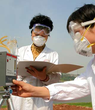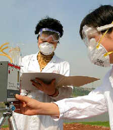 Experts test for chlorine gas in the air in Chongqing. Testing results indicate the air quality is normal. Tests by experts from local water works show that water quality in Jialingjiang River and from underground meets the required standard. [newsphoto]