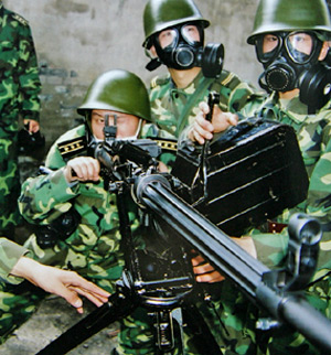 Army soldiers use an armor-piercing cannon to detonate chlorine gas tanks in Chongqing after an accidental leak April 18, 2004. The three remaining gas tanks were detonated at the Tianyuan Chemical Plant to avoid further leaks. Nine people were killed and 150,000 residents were evacuated in Southwest China's Chongqing Municipality. [newsphoto]