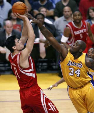 Rush also made two 3-pointers in the fourth quarter of Game 1. O'Neal picked up his fourth foul less than three minutes into the third quarter with the game tied. With backup Slava Medvedenko sidelined by a strained right Achilles' tendon, Lakers coach Phil Jackson had no choice but to leave O'Neal in. Bryant made two free throws and O'Neal converted a three-point play to give the Lakers a 61-56 lead. The field goal was O'Neal's second of the game. Bryant scored six points in the last 15.8 seconds of the period to give the Lakers a 74-64 lead. O'Neal had only two points and four rebounds in the first half, playing only 14 minutes because of foul trouble. The Lakers scored eight straight points for a 33-25 lead early in the second quarter. But the Rockets went on an 8-0 run of their own to finish the period for a 46-44 halftime lead. Yao scored 10 points in the first nine minutes to equal his total in Game 1. O'Neal blocked Yao twice in the opening 19 seconds, but committed two fouls in the first 6:05 and sat out the rest of the first quarter, which ended with the Lakers leading 23-22. |