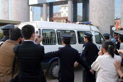 The van carrying Ma Jiajue, a Yunnan University undergraduate suspected of killing his four roommates in February, arrives at the court April 22, 2004 in Kunming, capital of Southwest China's Yunnan Province. The Kunming Intermediate Court began trying the case April 22, 2004. [newsphoto]