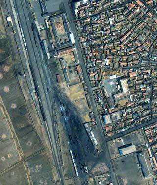 A satellite photo of the North Korean city of Ryongchon, also known as Yongchon, taken May 13, 2003 shows the train line running from the top left of the image to the bottom centre.[Reuters]