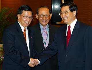 Chinese President Hu Jintao meets with Fidel Ramos (centre), director of the board of the Boao forum for Asia and former president of the Philippines, and Long Yongtu, secretary-general of the forum April 23, 2004 at Boao, Hainan Island. [newsphoto]