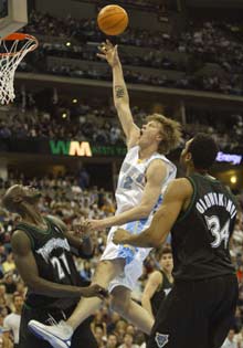 They can even the series Tuesday in Denver. Denver's previous home playoff game was May 2, 1995, a 99-95 loss to San Antonio. Latrell Sprewell scored 25 points and Kevin Garnett added 24 for the Timberwolves, who fell behind by 17 points early in the game and only mounted one serious threat after that. Garnett added 11 rebounds, but that was far fewer than the 21 he had averaged in the first two games of the series. The Nuggets, led by Marcus Camby's 16 rebounds, had a 53-36 edge on the boards. Sprewell's 3-pointer got the Timberwolves within 67-59 with just under 6 1/2 minutes left in the third quarter, but Minnesota didn't get another field goal until Garnett hit a layup with 10:53 to go in the game. By then, it was too late. Miller hit two free throws after Sprewell's 3, starting an 11-0 run ¡ª capped by Voshon Lenard's 3-pointer from the corner ¡ª that made it 78-59 with 3:12 to go in the period. After that, The Timberwolves never got closer than 15 points. Denver never trailed, thanks to 61 percent (11-for-18) shooting in the first quarter. The Timberwolves missed 14 of their first 17 shots. But the Nuggets, who went on an 11-0 run after the midpoint of the period and led 23-6 with just over 3 1/2 minutes left, couldn't maintain that pace. They were just 6-for-23 from the field in the second quarter and led 54-41 at the half. Nene had 14 points on 7-for-8 shooting for Denver, after going 4-for-14 from the field in the first two games. Camby had 12 points and Earl Boykins finished with 10. Wally Szczerbiak had 11 points for the Timberwolves, who are seeking their first playoff series win in eight tries. Sam Cassell added 10 points for Minnesota. Before Saturday night, the Nuggets hadn't won in the postseason since beating Utah 94-91 on May 19, 1994 in their former home, McNichols Arena. That was in the Western Conference semifinals, also the last time Denver made it out of the first round. |