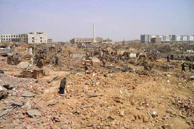 North Koreans stand amidst rubble near the railway station in Ryongchon, North Korea, April 24, 2004. At least 161 people, including 76 students, were killed and more than 1,300 people were injured in a catastrophic explosion at the railway station in the town of Ryongchon near the Chinese border on April 22. [Reuters]