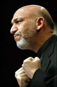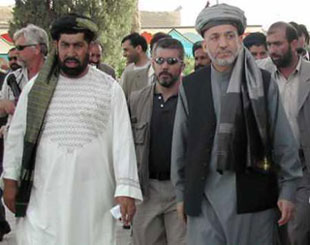 Afghan President Hamid Karzai (right) walks with Minister of Urban Development Gul Agha Shirzai in Kandahar, April 24, 2004.  [Reuters]