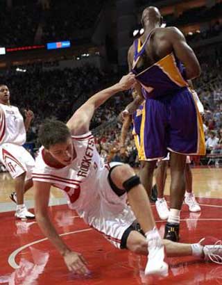 Houston Rockets' Bostjan Nachbar, of Slovenia, rips the jersey of Los Angeles Lakers' Karl Malone after being fouled while going up for a shot during the second quarter in Game 4 of the first-round Western Conference NBA playoffs April 25, 2004 in Houston.[AP]