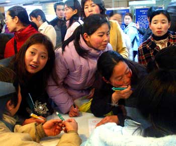 Women look for job information at a job fair in Nanjing, East China's Jiangsu Province. [newsphoto/file]
