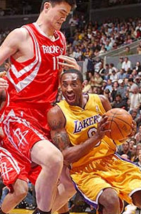 Jim Jackson scored 17 points and Cuttino Mobley and Steve Francis added 16 each for the Rockets, who committed 22 turnovers. Yao Ming managed just 10 points. Bryant had some trouble in the first quarter staying with Mobley, who made three 3-pointers and scored 14 points, giving Houston a 27-24 lead. But a reverse two-hand dunk gave the Lakers a 31-29 edge early in the second period and seemed to get Bryant going. The Rockets still held a 48-47 halftime lead before unraveling in the third quarter, making just 2-of-16 shots while committing four turnovers. Malone had two jumpers in a 9-1 burst that gave the Lakers the lead for good and Bryant had a layup and 3-pointer to make it 69-55 with 1:08 to go. Bryant left to a standing ovation and hugs from his teammates midway through the fourth quarter. |