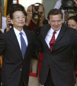 "Economic and trade exchanges between China and Germany account for a third of Sino-EU trade volume," Wen said. Indeed, China is Germany's third largest trading partner in Asia and bilateral trade reached US$41.8 billion last year, Wen noted. The German chancellor said the two nations take similar or identical stances on many international issues. He stressed that Germany will strictly follow the one-China policy and will not change that stance. The two sides have agreed to set up a regular meetings mechanism at prime ministerial level to continue to enhance consensus on major international issues, Wen said at a joint news conference after the two leaders met. China also suggested setting up regular dialogue on anti-terrorism and legal issues, Wen said. The premier expressed his congratula-tions and support for the EU's enlargement, noting that China attaches great importance to the union's role in dealing with political and economic affairs. China thinks highly of its EU relationship, regarding it as long-term, and influencing the future of the of the world, he said. "A sound Sino-EU relationship will not only benefit China and the EU but will be good for peace and stability of the world," Wen said. High-tech co-operation between China and Germany will serve as a pillar of bilateral economic co-operation, Wen said. Both leaders agreed to strengthen co-operation between their nations' respective enterprises, especially between small and medium-sized enterprises. The governments will provide more convenient conditions to that aim, Wen said. To encourage more Chinese firms to invest in Germany, China will offer preferential measures on bank credit, trade policy, insurance, and finance and investment policies, Wen said. Among the 7,000 Chinese enterprises that have invested abroad, more than 600 have invested funds in Germany, Wen said. On the removal of EU weapon embargoes to China, Wen said it is the right time to end the embargoes. He said China opposes connecting the issue with any other matters. Schroeder said Germany will push the EU leaders to admit China's position as a market economy and for an early termination of the arms embargo against China by other EU nations. Answering an inquiry on nuclear technology co-operation, Wen said collaboration between China and Germany is equally and mutually-beneficial and is for completely peaceful purposes. A Chinese culture centre will be established in Berlin in the near future, Schroeder said. Before the news conference, the two leaders appeared at a signing ceremony for agreements and contracts on technological co-operation to reinvigorate the traditional Chinese Northeast industrial base and some other projects. Before the meeting with Schroeder, Wen also visited Potsdam, where the famous Potsdam Agreement was signed in 1945 after World War II. That signing confirmed Taiwan is a part of China, paving the way of Taiwan's returning to the motherland, he said. |
