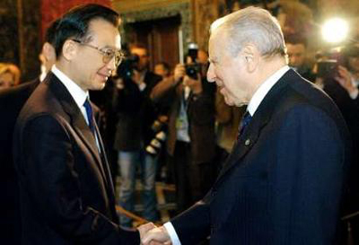 Chinese Prime Minister Wen Jiabao (L) shakes hands with Italian