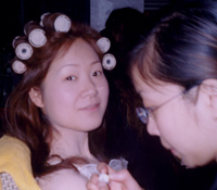 After finishing shopping in the late afternoon, we went to decorate their new home. Aunt Huahua stuck the red double-happiness paper-cuts on every door and window in the house, on the TV set, the refrigerator, the computer, the kitchen cupboards and anywhere else there was an empty, flat surface. Then Dai and aunt Huahua returned to Jintan. I accompanied Chen Jing to the special wedding store where she would go the next morning to try on the two wedding dresses she had rented for the wedding ceremony and banquet. At the wedding eve, I shared the bed with Chen Jing at uncle Minmin's home. It was a bed I knew very well. In our primary school years, I spent many summer vacations at Chen Jing's home, sharing the same bed. Before going to bed, she checked over the dress and pair of red shoes she would wear on the following morning, had a good bath and put on an SK-II beauty mask. From the bed I kidded her, "Do you really expect to turn into a pretty woman overnight by using a beauty mask?" She smiled behind the mask and said, "On your own wedding eve, you will understand how I feel this evening." "So exactly how do you feel?" I asked. She turned her back to me, saying, "Well, we'd better get some sleep now. We have to get up very early tomorrow." After a long silence, when I had almost fallen asleep, she burst out, "I have counted thousands of sheep, but I am still wide awake." Her bridegroom was obviously caught up in the same kind of anxiety. By midnight, he'd already made two calls to Chen Jing to check on things for the following wedding day. The next morning at about 5, uncle Minmin woke us up. After a brief breakfast, Chen Jing and I took a taxi to the store. We arrived at a quarter to 6, but the store was already crowded with brides. They look like products on an assembly line: some were putting on their dresses, some were getting made up, and others were getting the finishing touches on their hairdos. Impressed by the busy and interesting scene, even I, who had no plans for a luxurious and complex wedding, would like to try such a professional sequence of services. Chen Jing was eager to jump into the fray immediately. First, we grabbed the large box with her name on it, which contained the two dresses she had rented. I helped her put on the long floor-length sleeveless white dress. It was so tight she had to take a deep breath before I could close the zipper on the back. It reminded me of how the old African-American nurse dresses Scarlet in "Gone with the Wind." Then she was asked to sit down in front of a mirror. Two young attendants curled her hair while another one applied foundation cream on her face, neck, bosom and arms. Then she was passed on to another make-up attendant to have her face done. After that, a hairstylist coiled her hair and decorated it with pink lilies and roses. Chen Jing enjoyed the whole process, while I took photos of her during every stage. Now and then she looked at the mirror and asked me, "How is my lip colour?" or "Does the hairstyle fit my face shape?" or "Do I look pretty?" I stood on her right at one moment, then on her left, then back again, always answering "yes," "yes," "yes." While getting made up, Chen Jing did not forget to contact her fiance by cell-phone. He and the best man were having the cars decorated at a flower boutique. An hour and 10 minutes later, everything was done. Chen Jing sat rigid near the door waiting for the car to pick us up and drive us home. While waiting, I helped her put on the pearl earrings and necklace. At half past 8, a car arrived to take us to uncle Minmin's home where our younger cousins Lulu and Haohao were waiting. They and I would represent the Chen family in accompanying the bride to her new home. Ten minutes later, the bridegroom and best man arrived. Uncle Minmin and aunt Shuzhen entertained them with eggs and sweet soup made of jujubes and glutinous rice. Journey to the new home Then amidst a thunderous burst of firecrackers, the bridegroom and the bride went out of her home to the car. Traditionally at this point, the bride and her mother should cry. The bride because she is sad to leave her home and will miss her parents, and the mother to show her wish that her daughter will love her husband, be good to her parents-in-law and take care of her sisters- and brothers-in-law. But nowadays, few do this. Following the new couple, cousin Haohao carried a red chamber pot in which aunt Shuzhen had placed jujubes, peanuts, longans, eggs and some chopsticks. According to the traditional custom, the bride's younger brother carries the chamber pot containing these things symbolizing the hope that the new couple will have a baby soon. Cousin Lulu carried a red suitcase in which there was popcorn and some money. The popcorn is a symbol meaning that the new family will flourish, while the money, called yaxiangqian, meaning "money at the bottom of a suitcase," is given by the mother to her daughter. In ancient China, women were not financially independent, so when they married and moved to the man's home, their mothers would give them some money as financial support. We, as part of the bride's family, along with some of the bridegroom's relatives, accompanied the newly-weds to their new home in cars. Before we arrived, an elderly woman aunt Shuzhen had invited had made up the new marriage bed, hiding some eggs, peanuts and walnuts inside the new quilt and putting the dolls, the socks, shoes and hat for their children on the quilt. Originally, the eggs were dyed red, but now, because of health factors and convenience, the eggs have a small double-happiness character pasted on them. While making the bed, the elderly lady is supposed to say auspicious things about the marriage. As we arrived at the new apartment, the noise of firecrackers burst out again. Two bundles of dried sesame stocks and wheat straw tied with red ribbon were set afire at the main door of the building to symbolize the prosperity of the newly-weds in