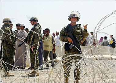 US soldiers stand guard at the entrance of the Abu Ghraib prison, 30 kms west of Baghdad, as Iraqis wait to have information about their loved ones held by US forces at the detention center. [AP Photo]