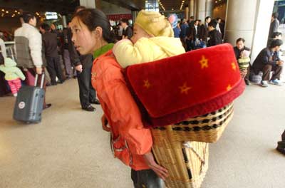 A migrant worker from Guizhou Province carries her baby as she gets ready to go home from Yuyao, Zhejiang Province, for the Spring Festival in 2002. Many married women in Fuyang, Anhui Province, choose to cut short breastfeeding and leave their babies in the care of grandmothers when they go to cities to work. [newsphoto/file]