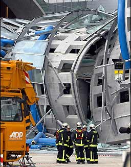 A general view shows rescue teams working near the collapsed footway of the new terminal 2E at Roissy airport, outside Paris. [AFP]