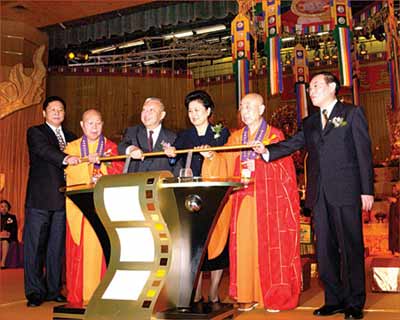 Central government official Liu Yandong (centre) and Chief Executive Tung Chee-hwa officiate at a grand ceremony to mark the unveiling of Buddha's "sarira" or finger bone relic at Hong Kong Convention and Exhibition Centre, May 26, 2004. [newsphoto]