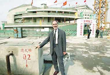 Paul Andreu, the chief designer of the National Theater, poses for a photo at the construction site of the somewhat controversial "egg shell." [newsphoto/file]