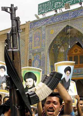al-Sadr chant in front of Najaf's Imam Ali shrine May 27, 2004. U.S.