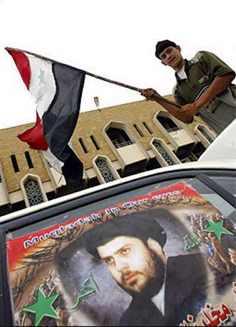 rides in a vehicle with a poster of Shiite cleric Moqtada Sadr plastered