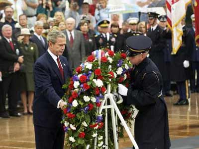 Atop a rain-swept hill in Arlington National Cemetery, the Republican president placed a wreath at the marble tomb of unidentified soldiers killed during the two world wars and in Korea, before bowing his head for a moment of silence. He stood in the cemetery's marble-columned amphitheater to extol U.S. soldiers overseas and describe the Iraq of Saddam Hussein as a terror regime akin to Taliban-ruled Afghanistan, which sheltered Osama bin Laden and his al Qaeda militants. "Through our history, America has gone to war reluctantly because we have known the costs of war. And the war on terror we're fighting today has brought great costs of its own," Bush said. But he said since the September 11, 2001, attacks on America, U.S. service men and women have displayed "decency and their brave spirit." "Because of their fierce courage, America is safer, two terror regimes are gone forever, and more than 50 million souls now live in freedom," Bush declared. Bush spoke as the combined U.S. death toll in Iraq and Afghanistan climbed toward 1,000 and the U.S. occupation of Iraq has increasingly become a political liability for him. With the approaching June 30 handover to an Iraqi interim government overshadowed by insurgent violence and a scandal over abuse of Iraqi prisoners, Bush's job approval ratings have hit new lows and stirred calls for the resignation of Defense Secretary Donald Rumsfeld, whom the president stood beside. Clashes with Sunni and Shi'ite Muslim insurgents in Iraq raised the U.S. death toll there by more than 200 in April and May alone. The two-month figure compares with the 138 U.S. soldiers who died during the major combat operations in Iraq that Bush declared over on May 1, 2003. Official Pentagon statistics show 802 U.S. dead and 4,682 wounded in Operation Iraqi Freedom as of Friday morning. Another 122 have died and 310 have been wounded as part of Operation Enduring Freedom, mainly in Afghanistan. The official figures do not include at least five soldiers in Iraq and four in Afghanistan killed during the weekend. Bush, who avoided combat in Vietnam while serving as a pilot in the Texas Air National Guard, has fashioned himself as a strong president presiding at a time of war for his re-election campaign against Democratic presidential candidate John Kerry, a decorated Vietnam veteran. Bush spoke on Saturday at Washington's new World War II memorial and will visit France on June 6 for the 60th anniversary of the Normandy invasion. Kerry made his own Memorial Day visit to the Vietnam Veterans' memorial, where he laid a wreath with the family of a soldier who died in 1976 of battle injuries he suffered in 1968. Kerry had pushed to have the man's name added to the list of 58,000 Vietnam fatalities. |