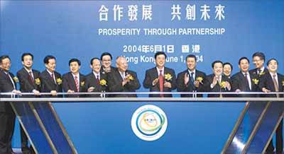 Guangdong Party Secretary Zhang Dejiang (centre), Hong Kong Chief Executive Tung Chee-hwa, along with other delegates, officiate at the opening ceremony for the Pan-Pearl River Delta Regional Co-operation and Development Forum which opened at the Hong Kong Convention and Exhibition Centre, June 1, 2004. [newsphoto]