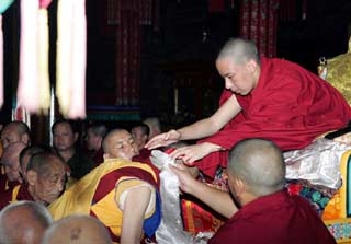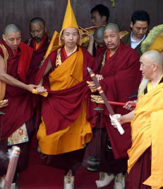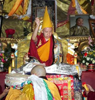 The 11th Panchen Lama Bainqen Erdini Qoigyijabu holds a Buddhist ceremony at the Yonghegong Lamasery in Beijing June 2, 2004. The Panchen Lama received worship from 30 Living Buddhas from northwest China's Gansu and Qinghai provinces and met a