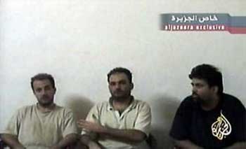 A video grab image shows footage aired on Al Jazeera television which it claims are three Italians held hostage in Iraq June 2, 2004. The tape, which is said to be dated May 31, includes one of the three men, shown eating at a table and then seated next to the others, and saying they were being treated well, Al Jazeera said. The man was speaking in Italian. [Reuters]