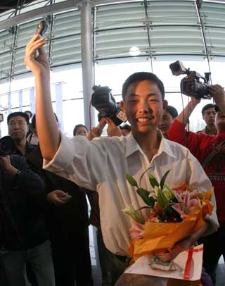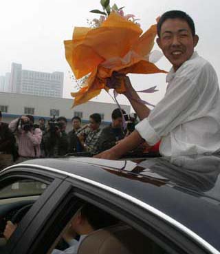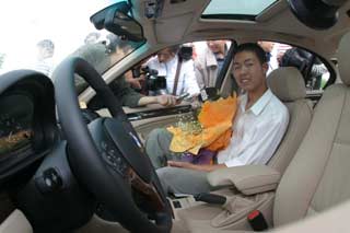Liu Liang smiles on top of his hard-won BMW car in Xi'an, Northwest China's Shaanxi Province June 4, 2004. In a 17 million (US$2 million) China Sports Lottery in Xi'an in March, 17-year-old Liu drew a winning ticket that offered a prize of 120,000 yuan (US$14,500) and a new BMW car worth of 480,000 yuan (US$58,000). But the lottery center claimed that Liu held a fake lottery ticket, prompting Liu to take the center to court. After investigations, The court found that Yang Yongming, contractor of the lottery ticket selling cheated on four top prizes. Yang and 4 other suspets have been arrested by the local police. On Friday, the Xi'an lottery center authorities declared the lottery ticket Liu held was valid and apologized for the scam. [newsphoto]