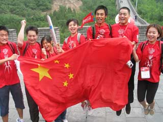 Torch carriers and defenders for the Athens Olympics display the torch and Chinese national flag on the Great Wall at Juyongguan Pass in suburban Beijing June 7, 2004. Some 40 of them who are taking part in Tuesday's torch relay in Beijing climbed up the Great Wall Monday. [newsphoto] |