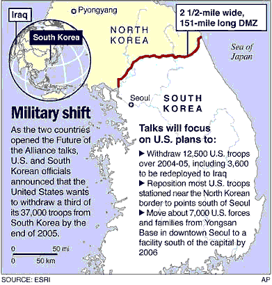 "US officials told us last night that under their Global Defence Posture Review they are planning to reduce the number of US troops here by 12,500 by the end of December 2005," Kim Sook, head of the foreign ministry's North America bureau, said. That would include 3,600 US soldiers already earmarked for deployment to Iraq from the ROK. A statement released by United States Forces Korea (USFK) confirmed the details of the proposed redeployment plan, although a USFK spokeswoman declined to comment further. Washington announced late last year that it aimed to transform its forces deployed worldwide using advances in military technology and smaller more mobile units to better respond to different types of security needs. Kim was briefing reporters after a first day of talks with US officials on moving American troops back from front-line positions near the Demilitarised Zone border with the Democratic People's Republic of Korea (DPRK). Asked whether the ROK had agreed to the pullout schedule, Kim said: "That is what the United States presented as their plan and we're going to discuss it." Kim said the US officials had said Washington would pursue the reduction very carefully because of the security conditions on the peninsula. The ROK had yet to receive notification of which US forces would be moved from which locations under the proposed reduction, Wi Sung-lac, a National Security Council official, told reporters. No formal discussion on the reduction took place at yesterday's ninth round of talks on relocating US troops within the ROK. Those talks, started last year, cover moving the US military headquarters from central Seoul to the south of the capital as well as the pullback from the Demilitarised Zone area that divides the peninsula. Kim said the United States welcomed Seoul's plans for a more independent defence and would actively help the ROK as it upgrades its military to be more self-sufficient. South Korean and US officials have said the redeployment to Iraq and any future changes to the US military in the ROK would not weaken their combined defence. The United States has earmarked US$11 billion for force upgrades, while the ROK has discussed plans to increase defence spending. Because the 1950-53 Korean War ended in a truce, the ROK and the DPRK are technically still at war. |