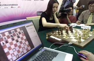 World chess champion Zhu Chen plays against a super Unisplendour Star laptop computer made by the Tsinghua Unisplendour Corporation (Thunis). Zhu lost to the laptop in the first round held June 8, 2004, in Beijing. The laptop is said to have excelled IBM's supercomputer Deep Blue which defeated World chess champion Garry Kasparov in 1997. The second round will be held on Saturday. [newsphoto]