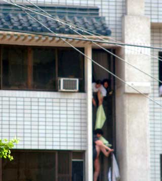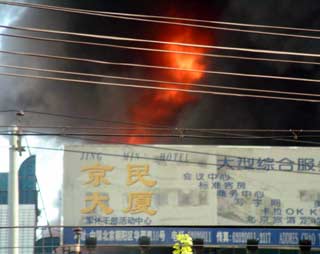 Flames poured out of the windows of the four-storey companion building and the heat was felt by the people in the nearby residential buildings, which is less than 10 metres from the site of the blaze, according to a witness who only identified herself as Wang. "Even the glass on the windows of my home became hot," said Wang, who lives on the sixth floor. According to Wang, the first two storeys of the inflamed building are for swimming, the third one is a dining hall, and the fourth is a dormitory for employees in the mansion. While the fire was raging, Wang saw many faces appear at the windows on the fourth storey, with one man trying to reach the ground by climbing down a sheet tied to the window, Wang said. "But the sheet broke and he fell," she added. She said another one lay outside of the building with a bloody face.