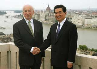 his Chinese counterpart Hu Jintao for the media in Budapest June 10, 2004.