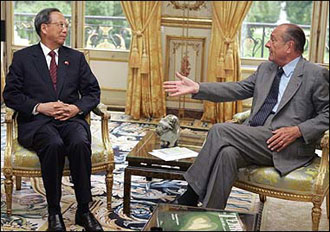 Vice Premier Zeng Peiyan (L) poses with French President Jacques Chirac at the Elysee palace in Paris. France and China signed billions of dollars' worth of trade contracts during Peiyan's visit. [AFP]