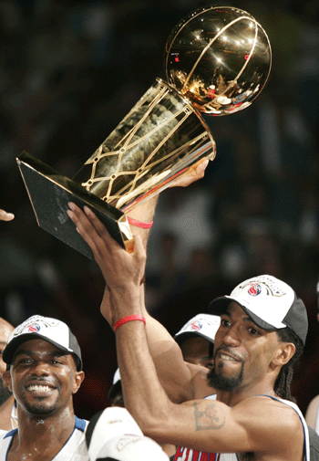 Pistons Rasheed Wallace holds up a championship sign after Game 5 of