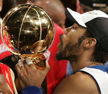 Rasheed Wallace leans in to kiss the Larry O'Brien trophy after the