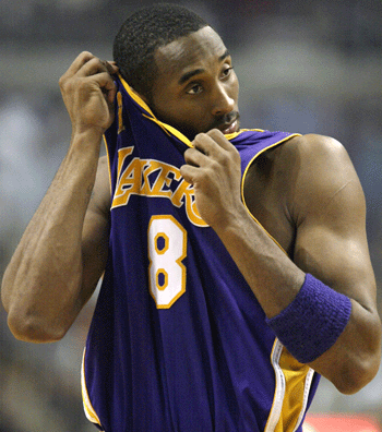 Lakers guard Kobe Bryant wipes his face during second half action against