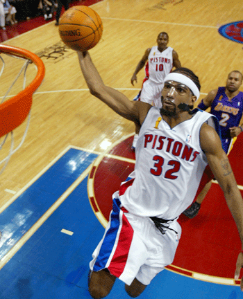 guard Richard Hamilton (32) dunks on the Los Angeles Lakers guard Derek