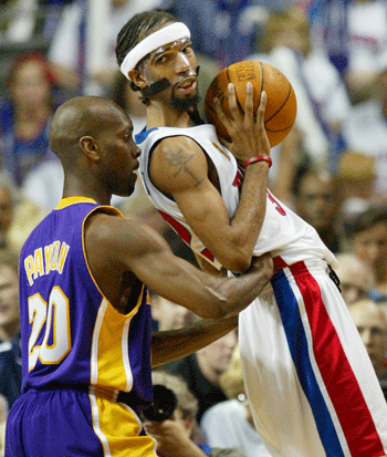 guard Richard Hamilton (R) keeps the ball away from Los Angeles Lakers