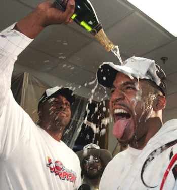 Pistons Corliss Williamson (R) is doused with champagne by former