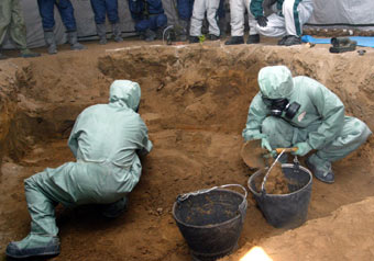 Chinese experts work at an excavation site where up to 500 gas bombs have been detected underground Friday, june 18, 2004 in Qiqihar, northeast China's Heilongjiang Province. [newsphoto]