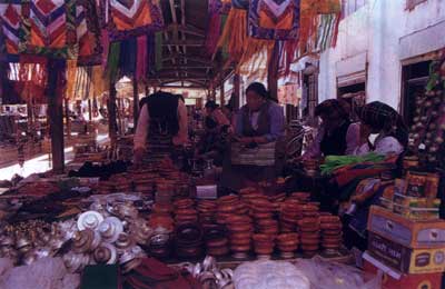 A stall in a Tibetan market offers a wide range of wooden bowls. [Tibet magazine]