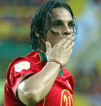 Portugal's Nuno Gomes blows a kiss after his goal against Spain in their Euro 2004 Group A soccer match at the Jose Alvalade Stadium in Lisbon, June 20, 2004. [Reuters]