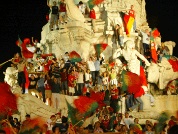 Portugese soccer fans celebrate in the centre of Lisbon after their victory against Spain, June 20, 2004. Portugal won 1-0 against Spain in their Euro 2004 Group A championships soccer match. [Reuters]