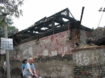 Local residents pass by the burnt building of the Huguo Temple in Beijing, June 20, 2004. Some buildings of the 720-year-old Huguo Temple, which is located at the Xicheng District of the capital, were destroyed in a fire occurred around 2 a.m. [Xinhua]