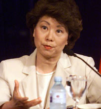 US Secretary of Commerce Don Evans (left) and Secretary of Labour Elaine L. Chao at a press conference in Beijing. [newsphoto]