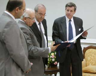 The ceremony took place in a formal room with Louis XIV furniture in an office in the building formerly used by the Iraqi Governing Council. Officials were seated in guilded chairs around a table, in the center of which was a bowl of flowers with a small Iraqi flag in it.