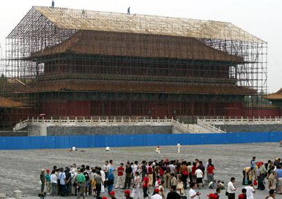 Workers build a temporary wooden roof over one of the many halls in the Forbidden City in Beijing Tuesday, June 29, 2004. [Reuters]