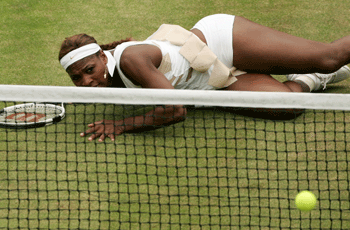 Number one seed Serena Williams watches her match point shot drop over the net to defeat her compatriot seventh seed Jennifer Capriati in their quarter final match at the Wimbledon Tennis Championships in London, June 30, 2004. [Reuters]